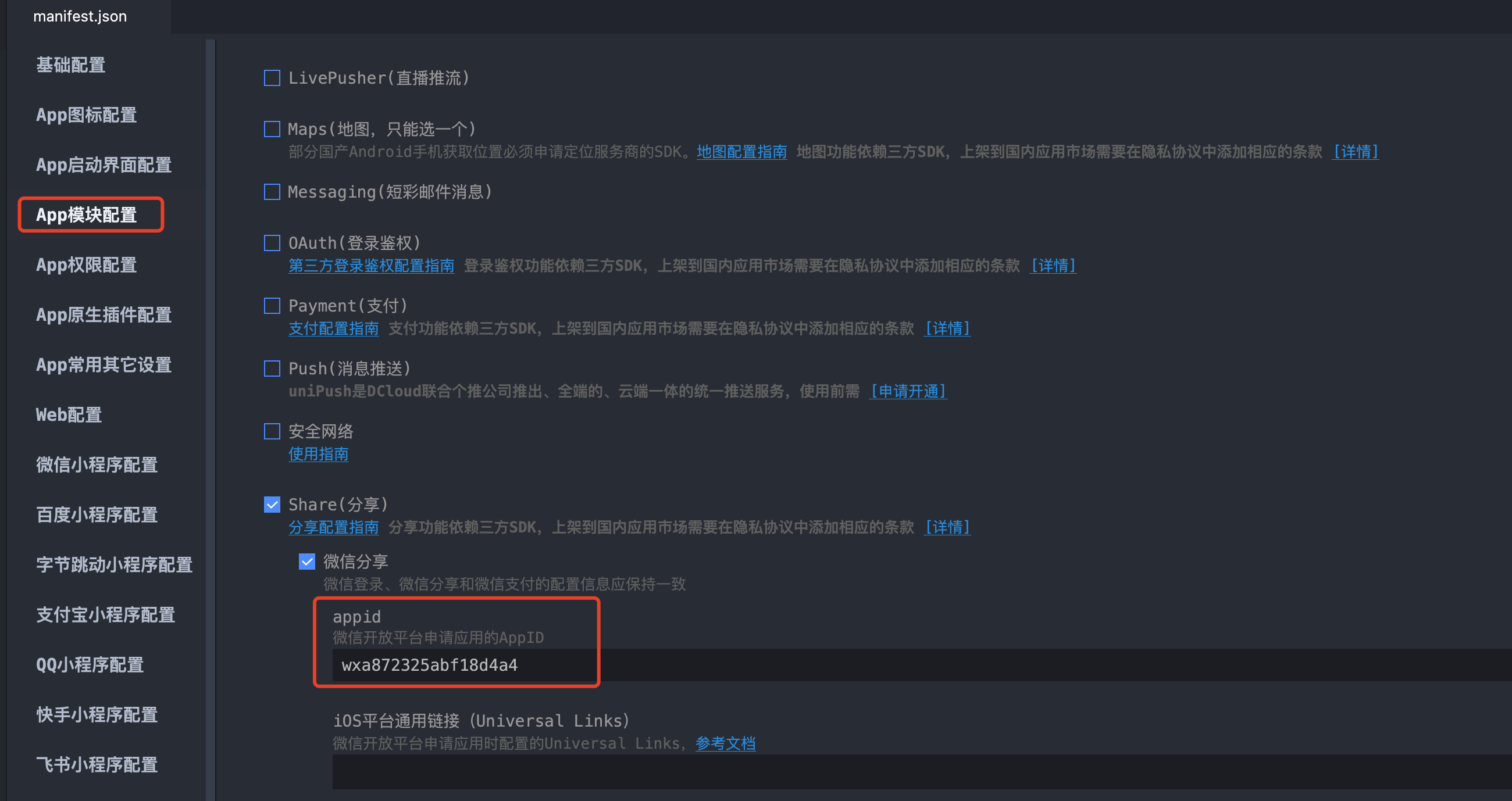 - 配置manifest.json中的App模块,配置微信分享中appid参数,该值为微信开放平台中的移动应用appId。