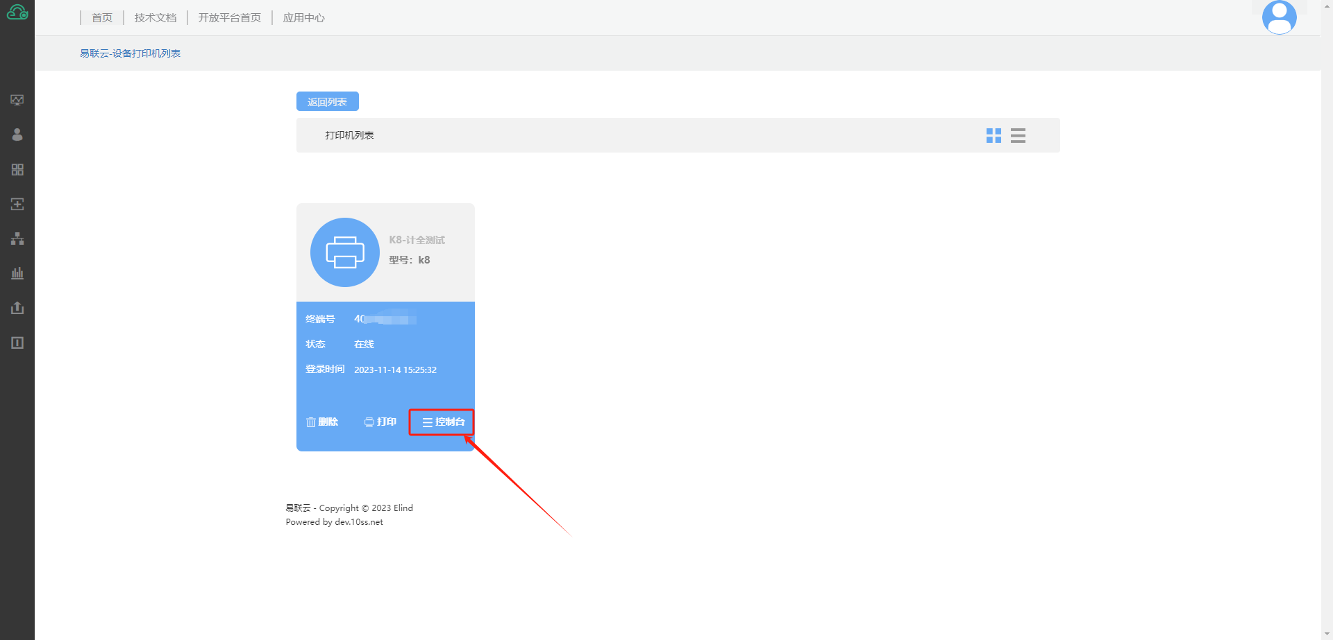 登录易联云管理平台,左侧菜单中选择【应用列表】,创建/找到自有型应用,点击【查看】,找到【应用下打印机】栏,点击【查看】,点击对应设备【控制台】,终端号、秘钥即设备信息