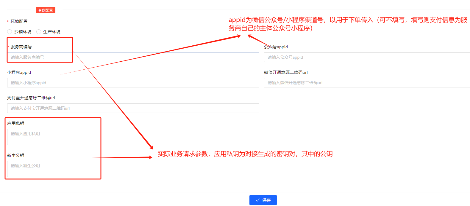 - 按渠道文档说明/对接人员沟通生成对应的签名公私钥,按如下配置,配置到服务商参数中