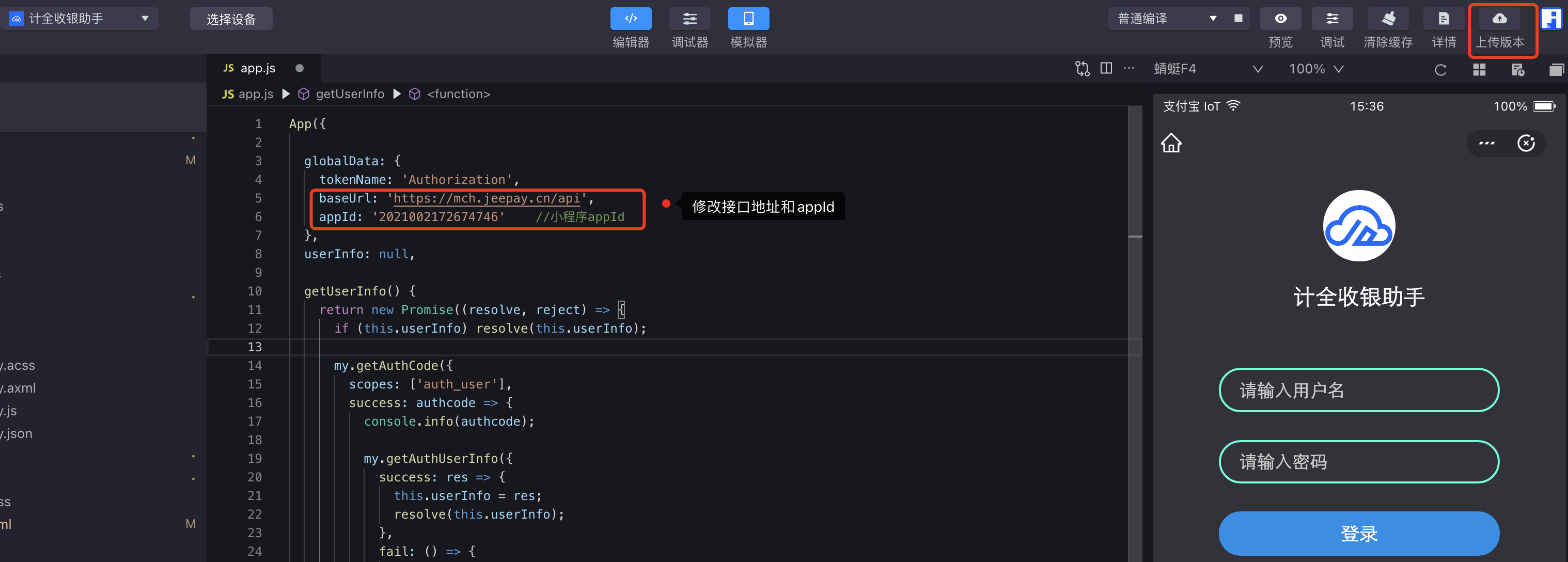 使用小程序开发工具,打开小程序端代码,设置appId和服务端域名。然后提交版本。